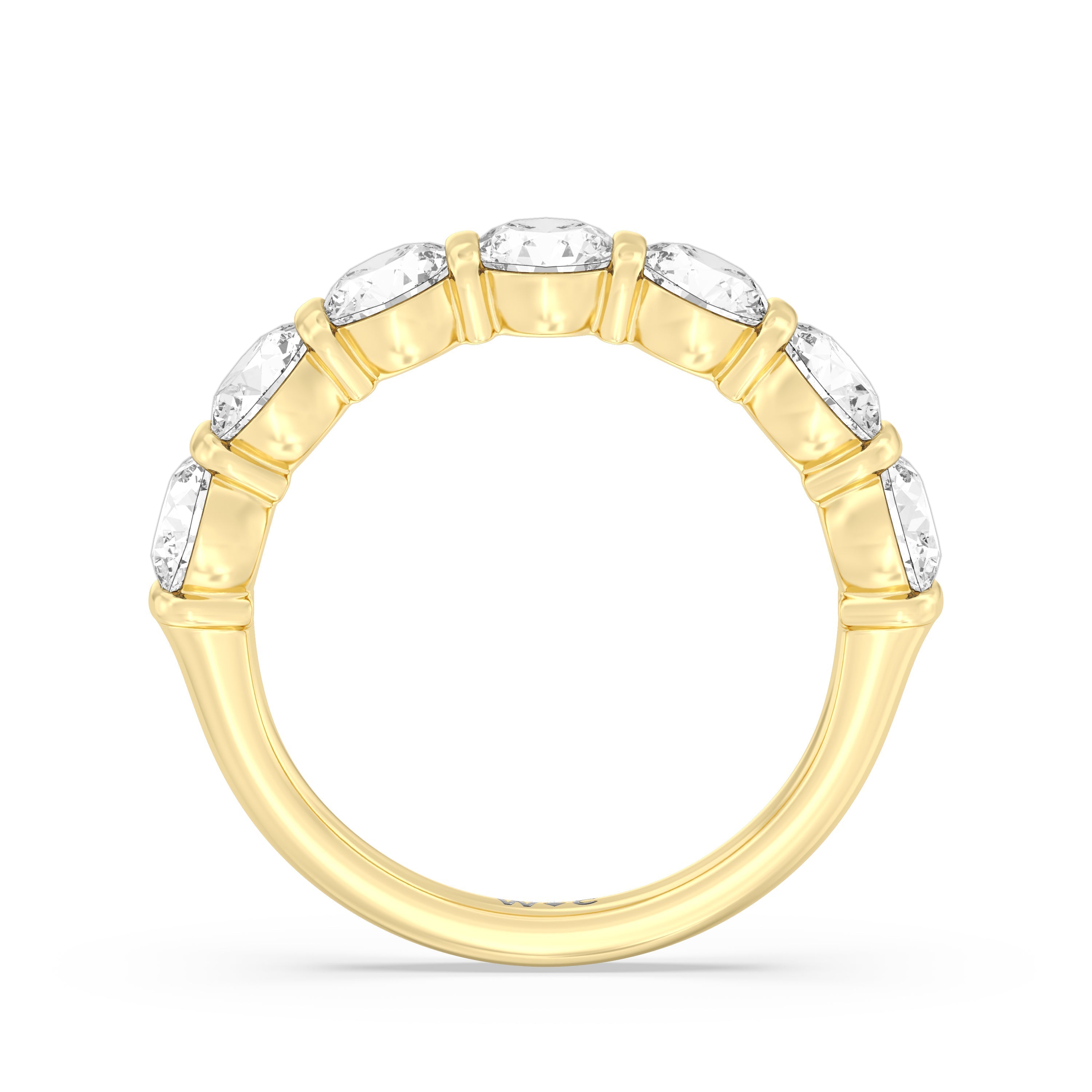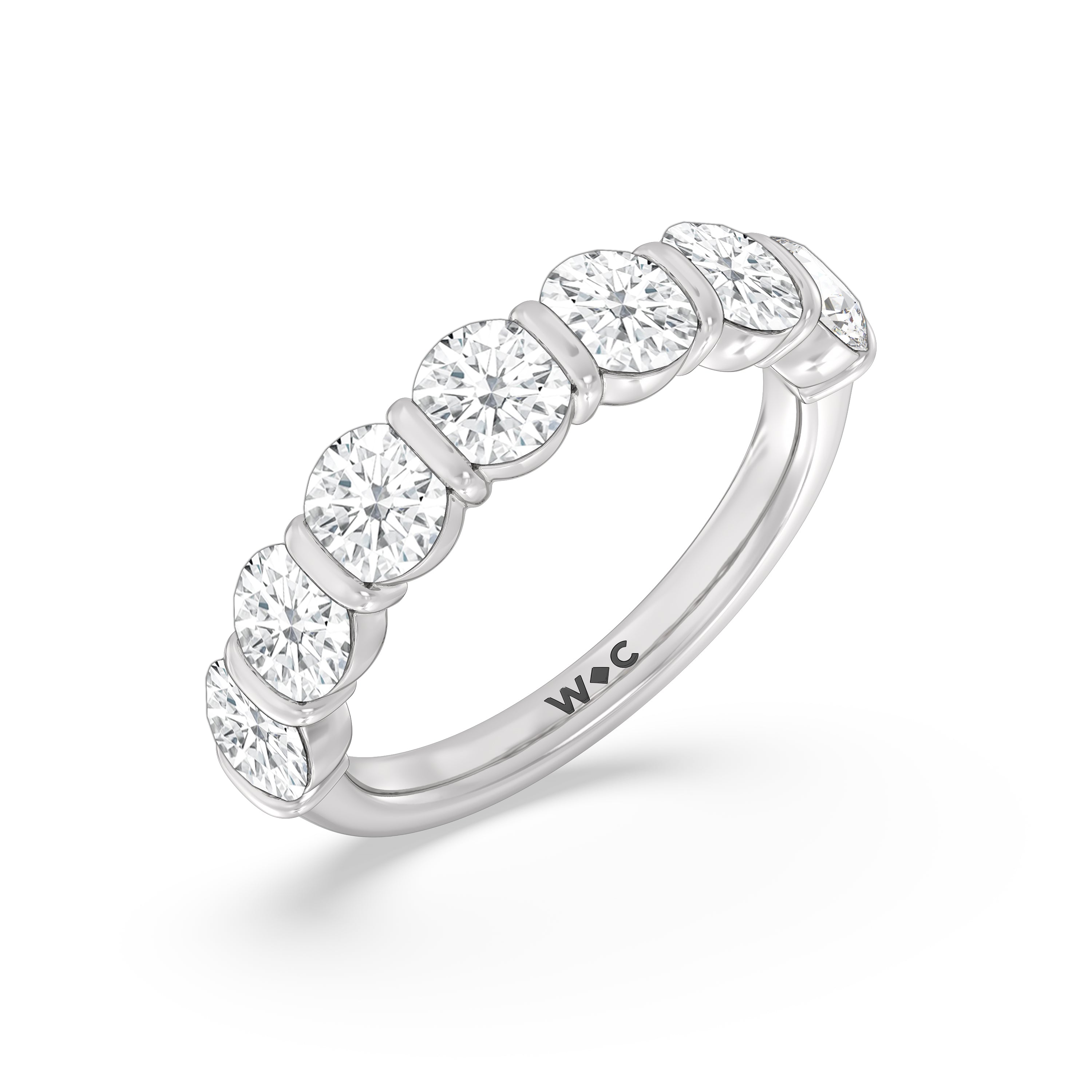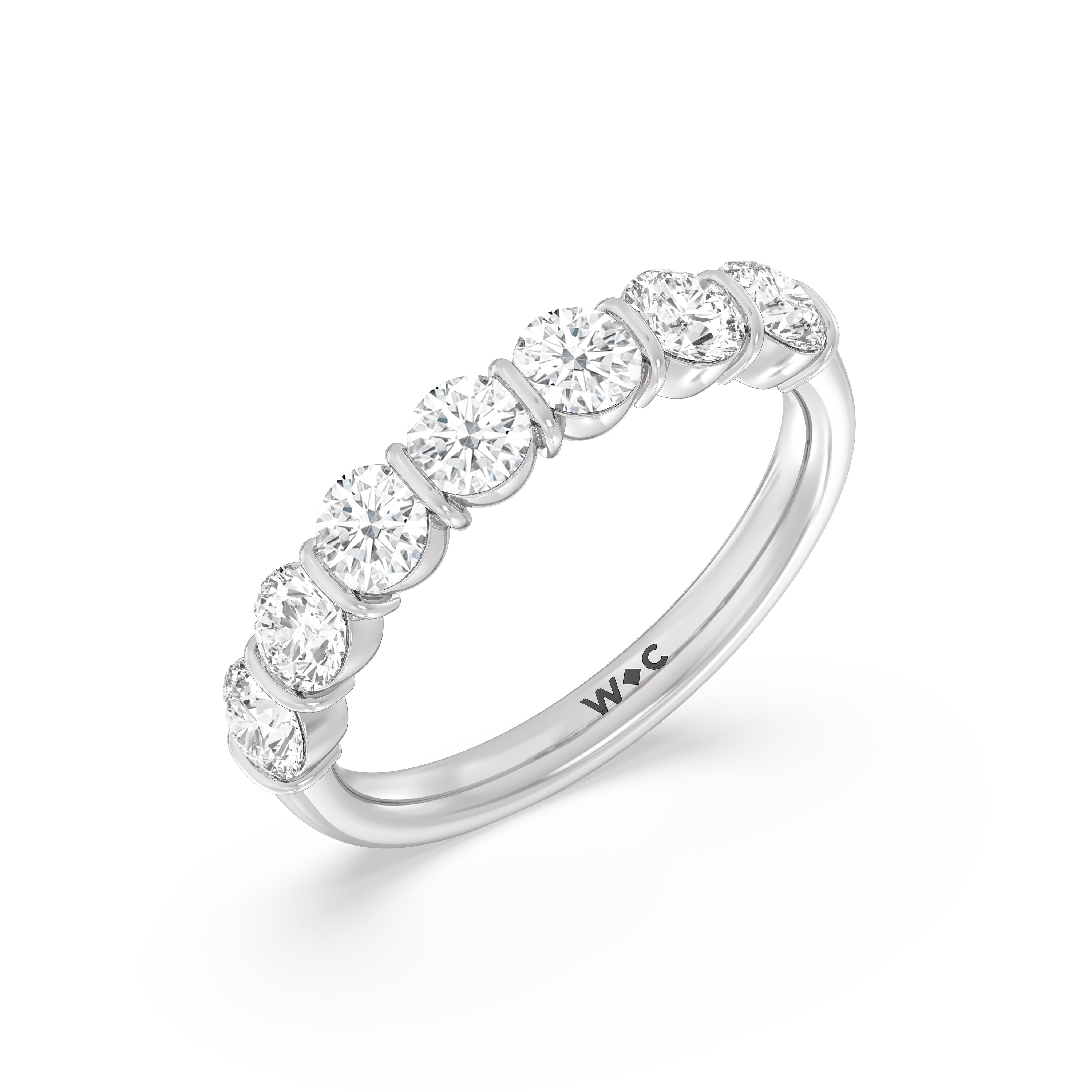 A sophisticated diamond ring designed to look polished and structured yet feminine and chic This anniversary ring features a total of eleven round diamonds, nine of which are of the same size tracing half of the band. Two slightly smaller diamonds punctuate each end of the glittering diamond arch.