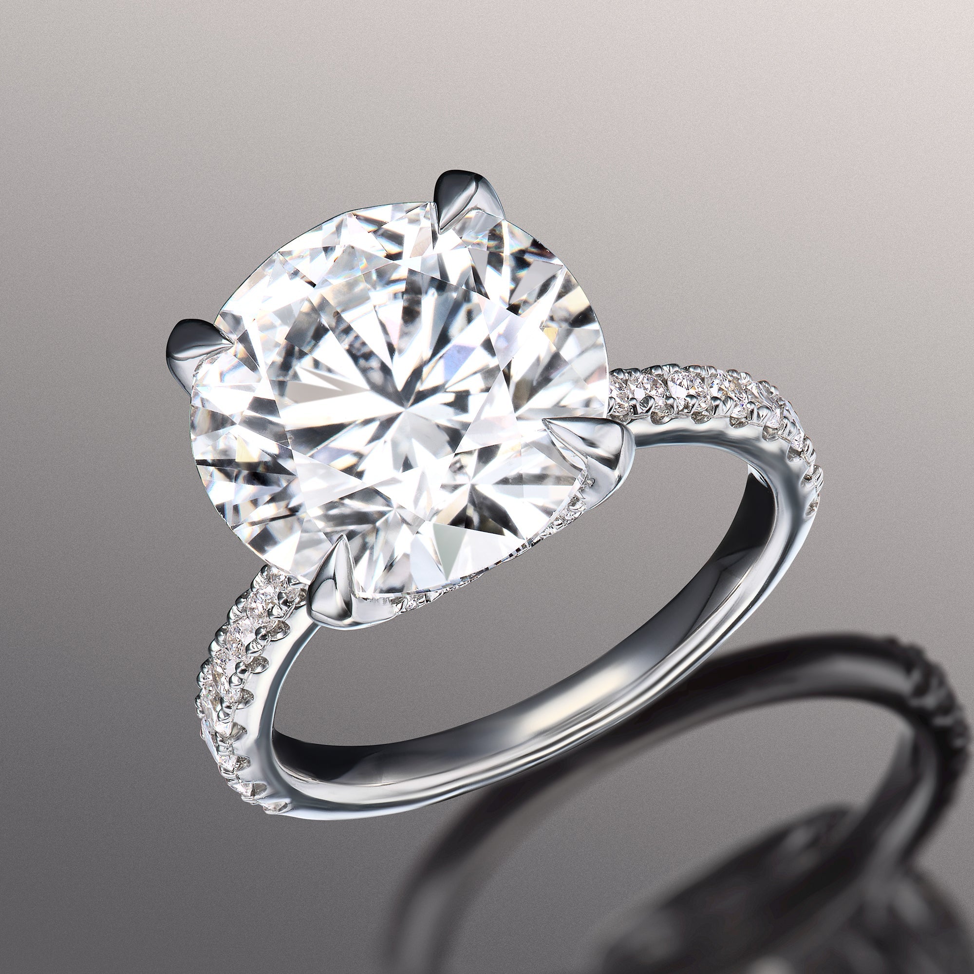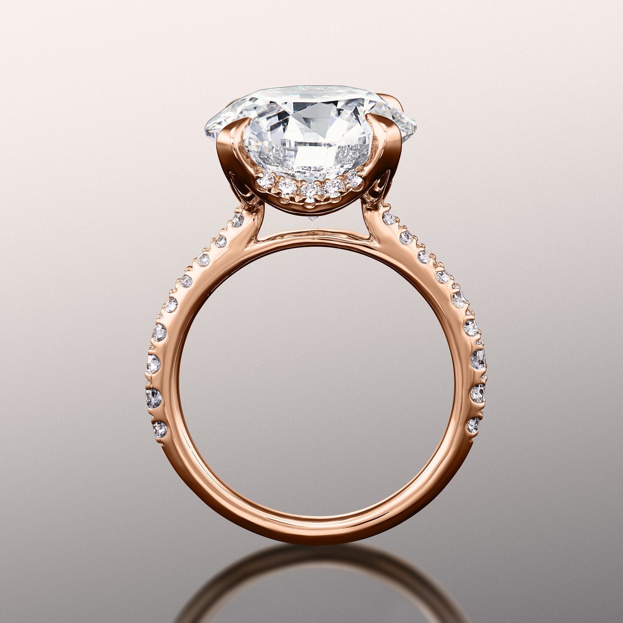 A phenomenal symbol of love. This ring is embraced with an incredibly brilliant round diamond center stone supported by diamond-encrusted u-shaped prongs. The imposing central gem sits high on a polished cathedral band with gracefully arching shoulders pavé-set with round diamonds in tapering sizes. This ring shines no matter which side you look at it, making a powerful statement.