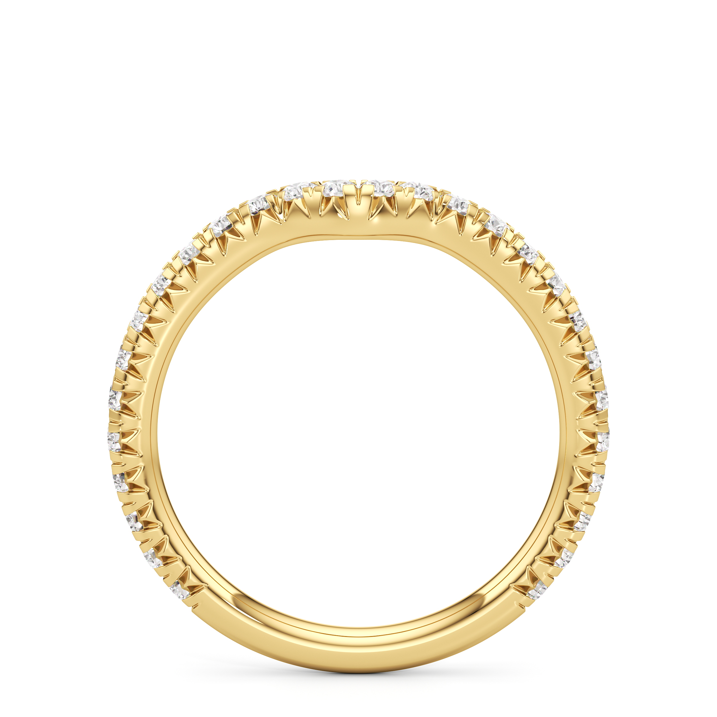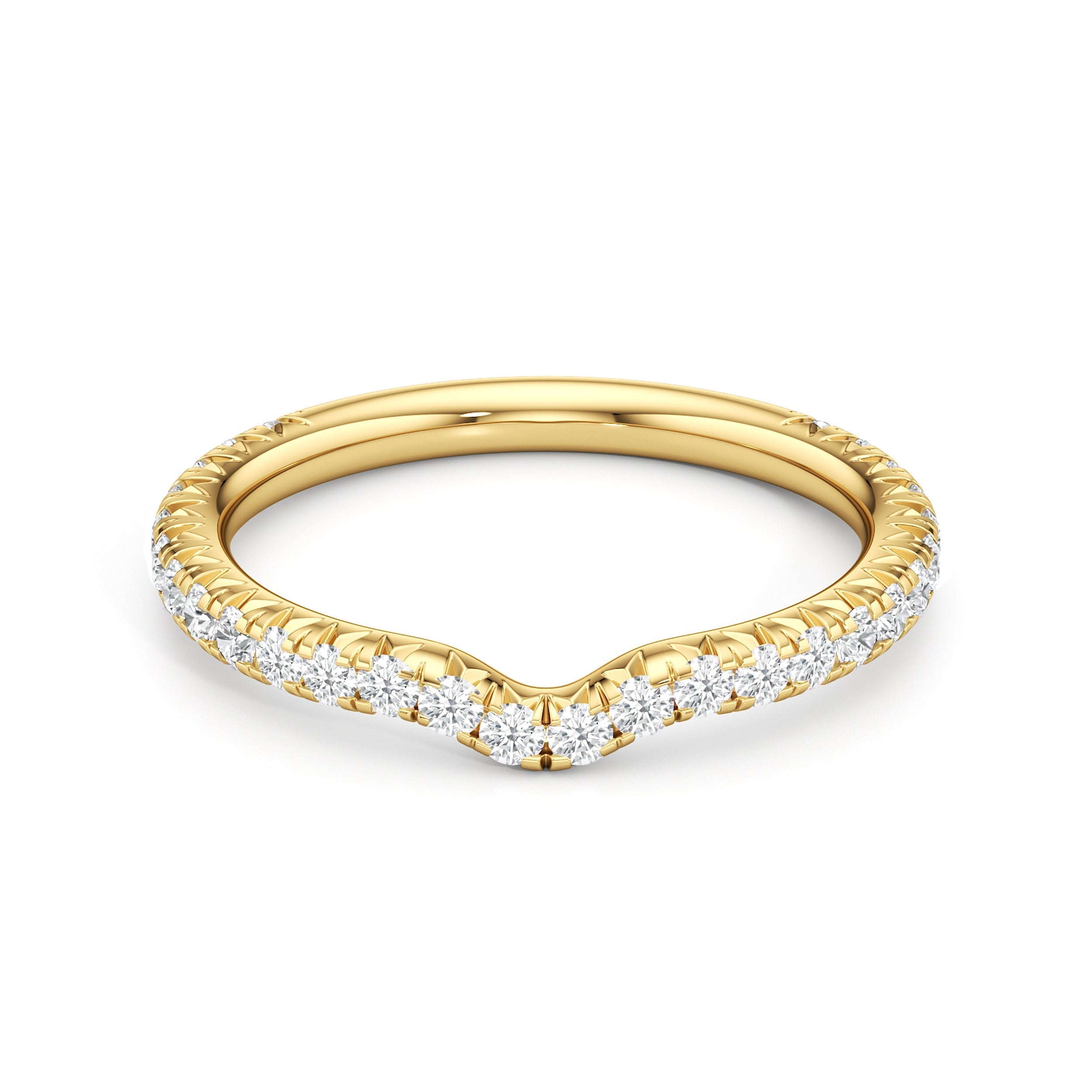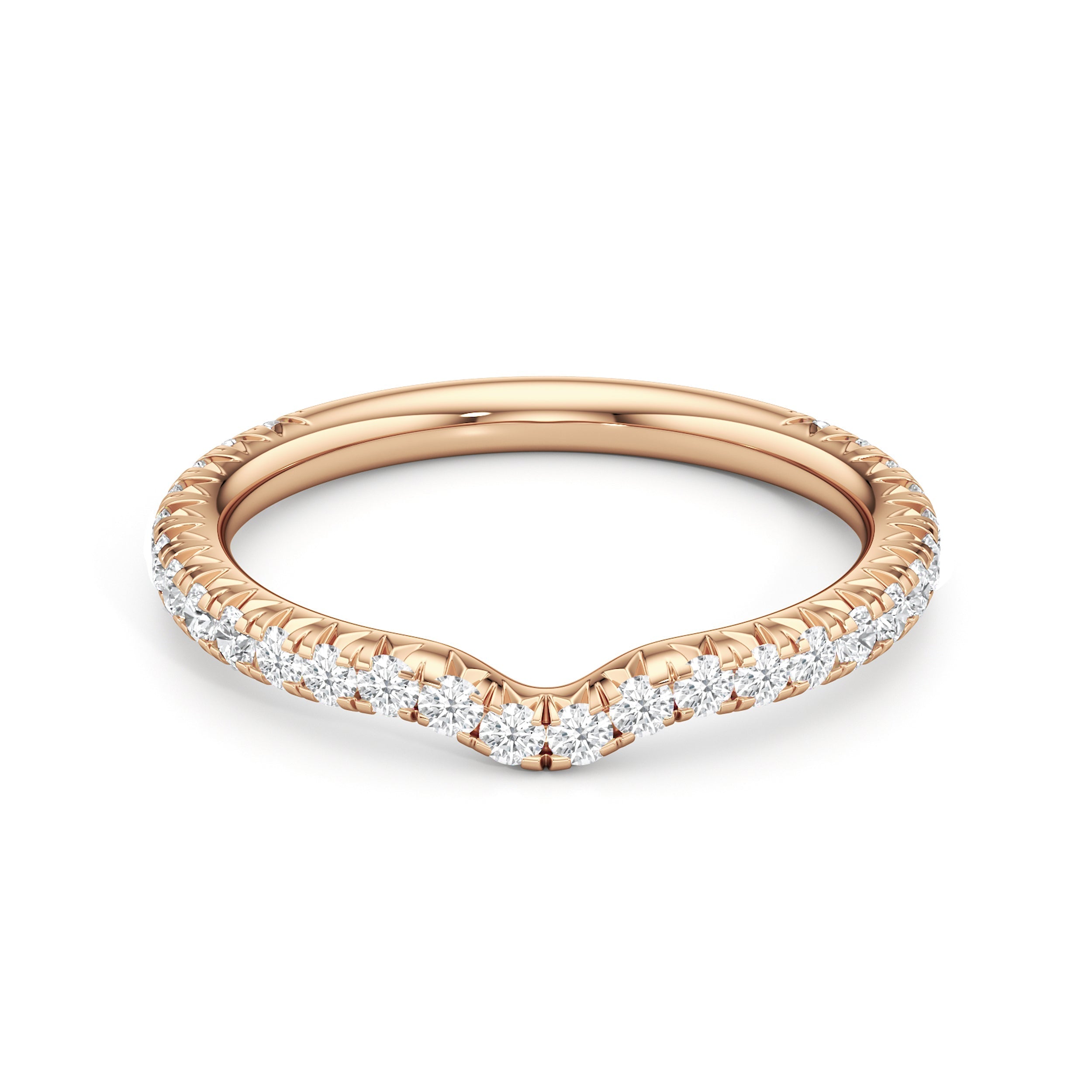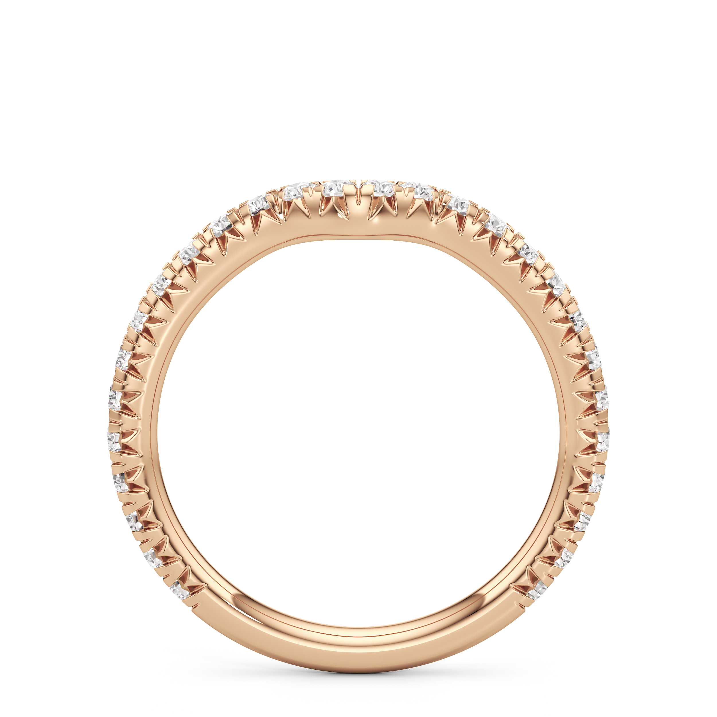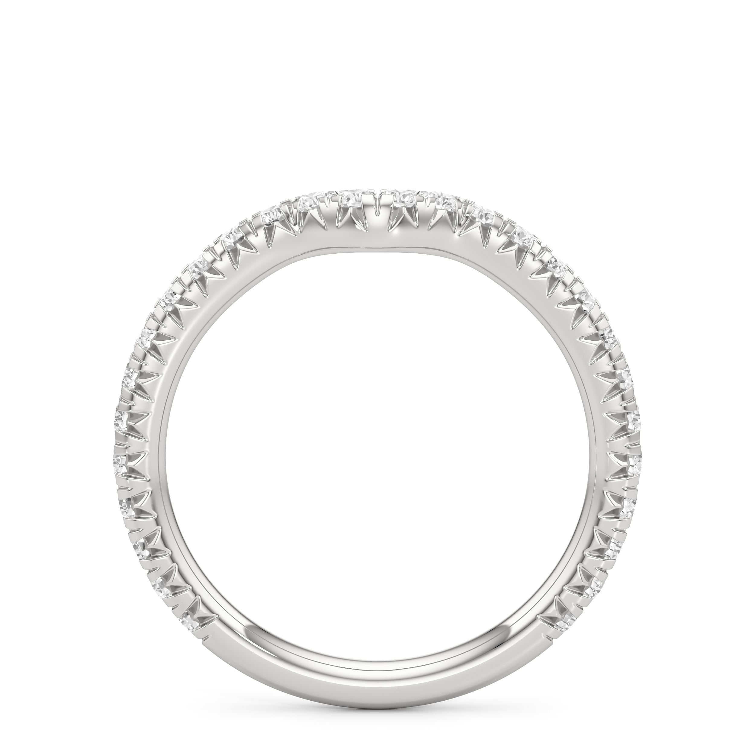 This curved diamond set wedding band is perfectly contoured to complement our the w pavé engagement ring for a simple and sophisticated look.