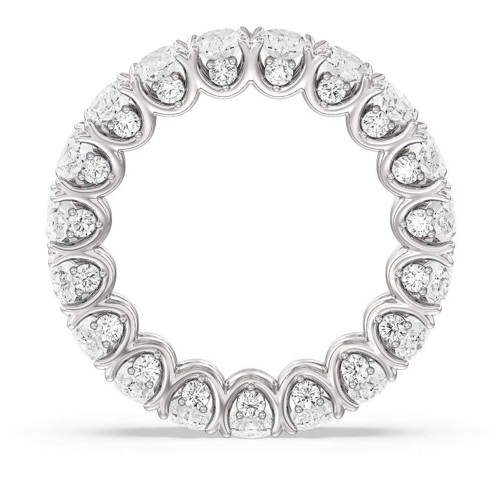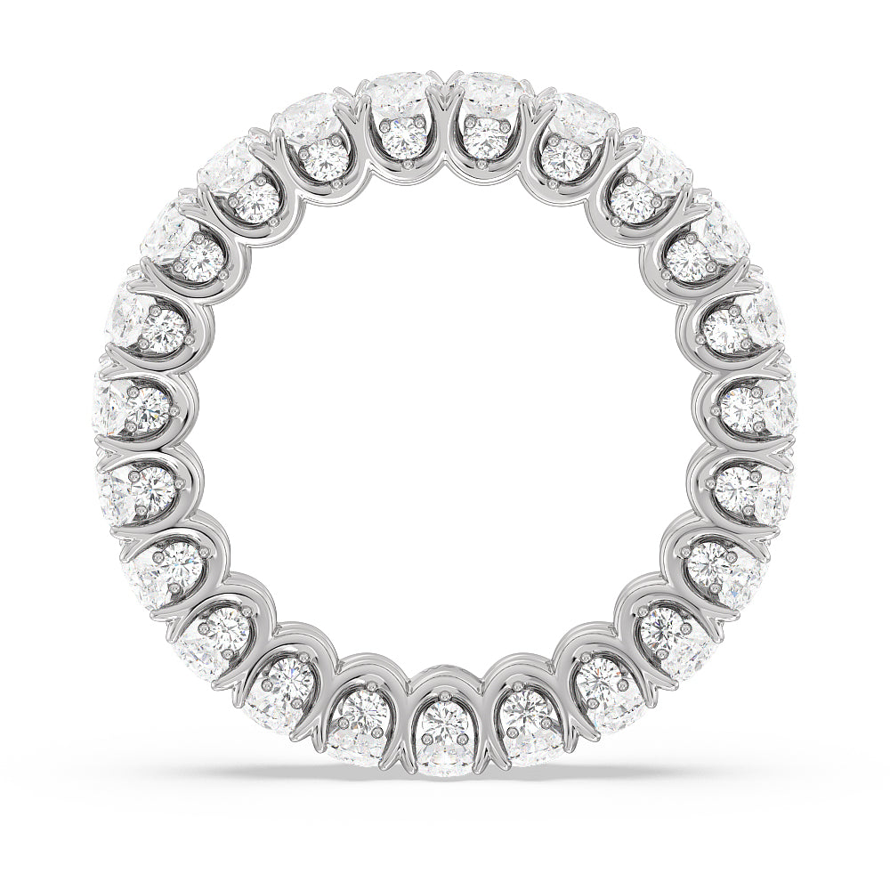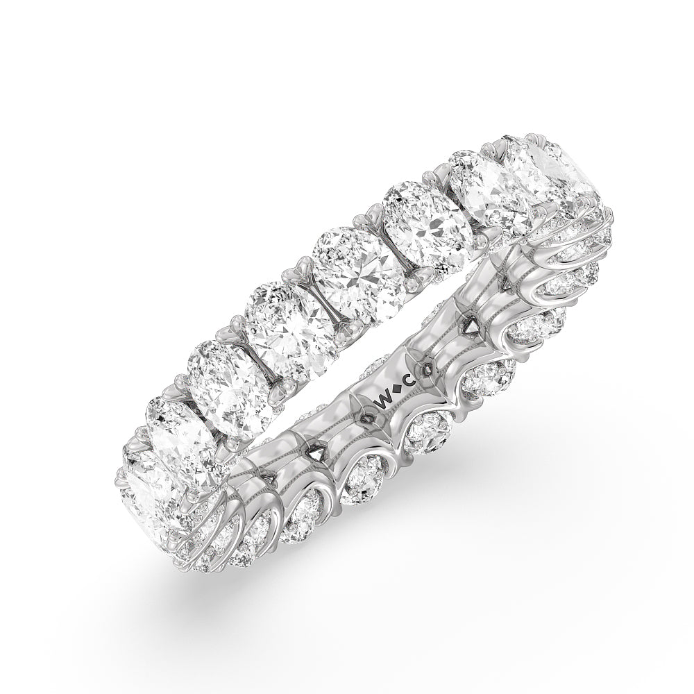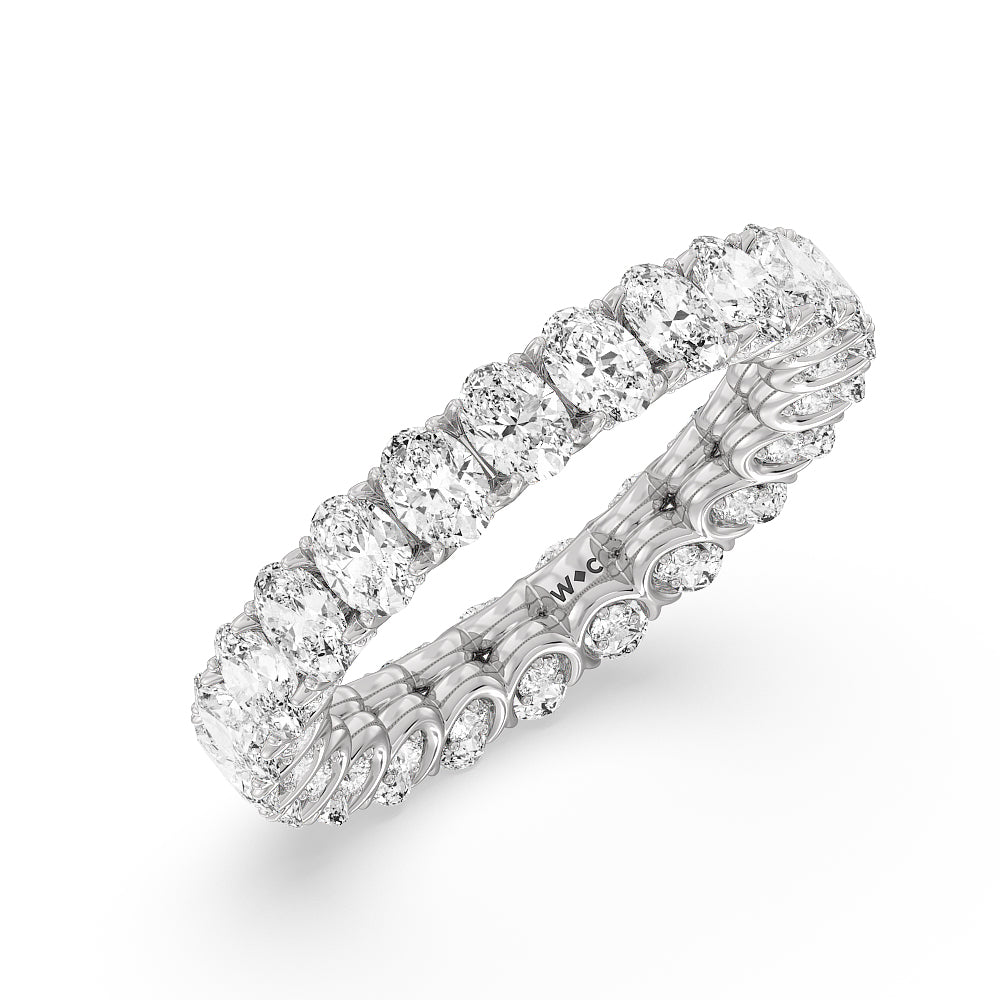Let the uninterrupted sparkle of this eternity ring mark your everlasting love. This white gold ring features oval-cut diamonds spanning the full circumference of the shank. Each oval diamond is set on a U-shaped prong basket. When viewed from the side, the ring displays a scalloped profile highlighted by petite round diamonds punctuating each curved point of the basket.