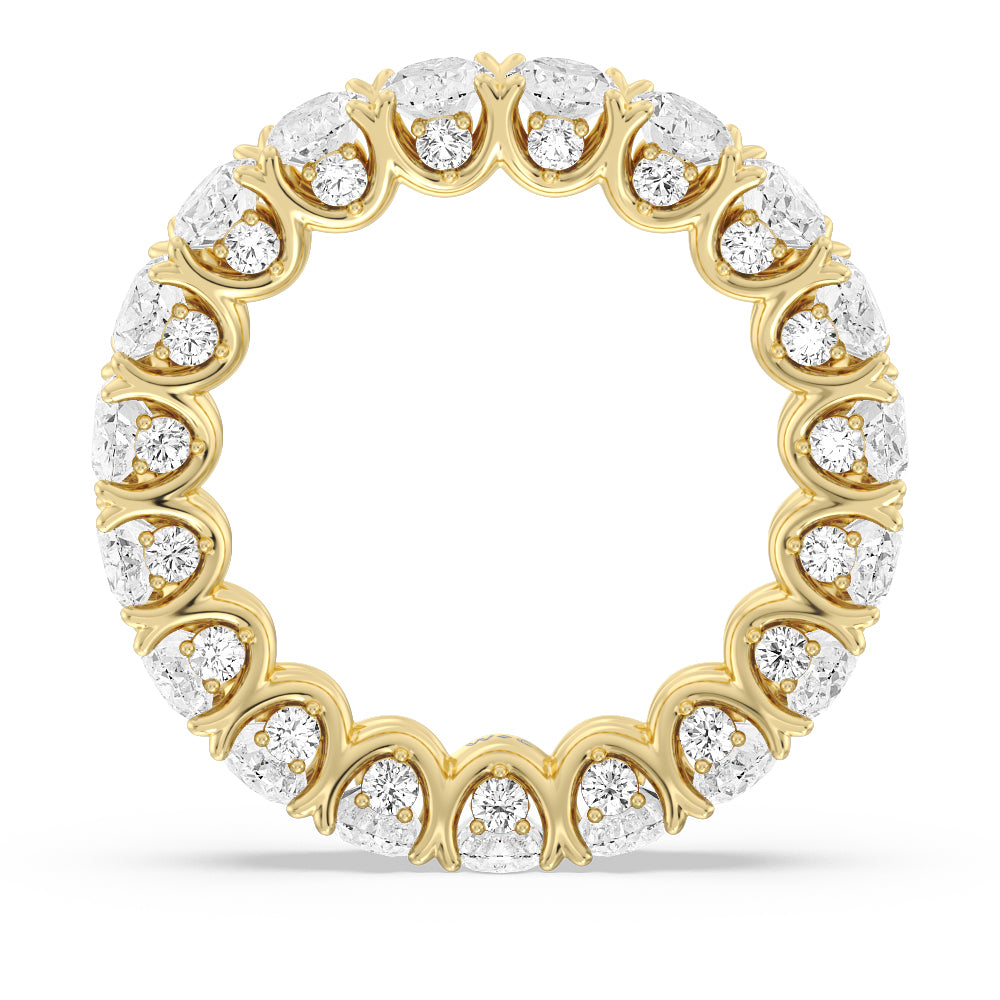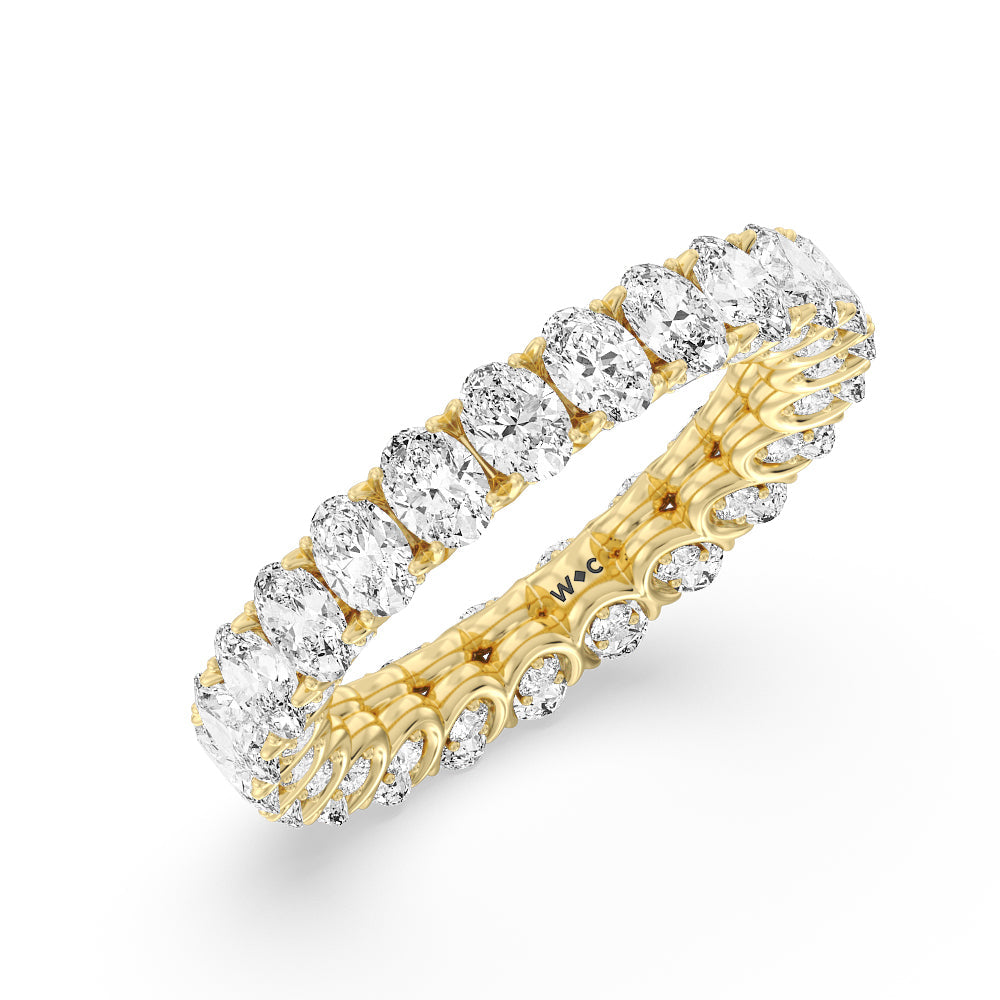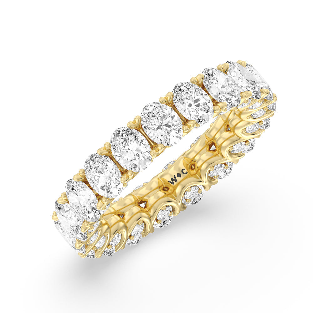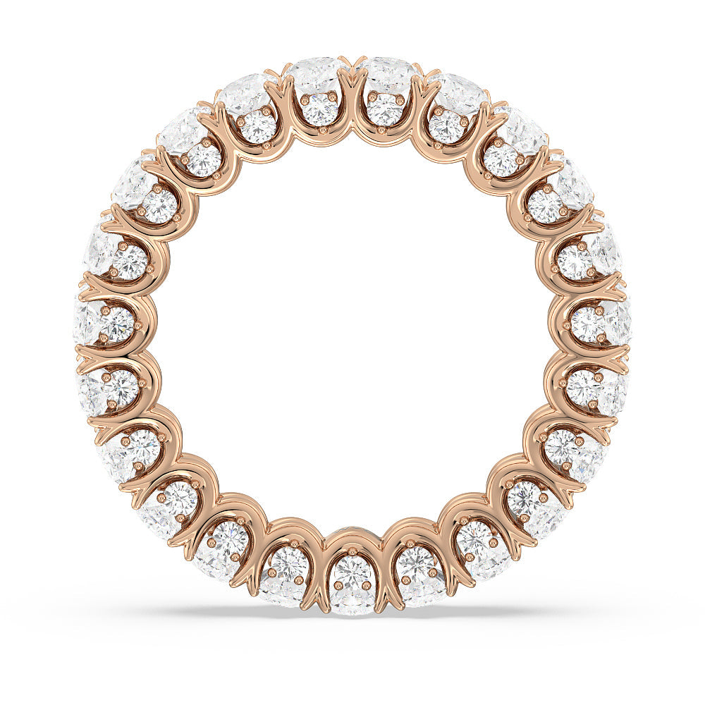 Let the uninterrupted sparkle of this eternity ring mark your everlasting love. This white gold ring features oval-cut diamonds spanning the full circumference of the shank. Each oval diamond is set on a U-shaped prong basket. When viewed from the side, the ring displays a scalloped profile highlighted by petite round diamonds punctuating each curved point of the basket.